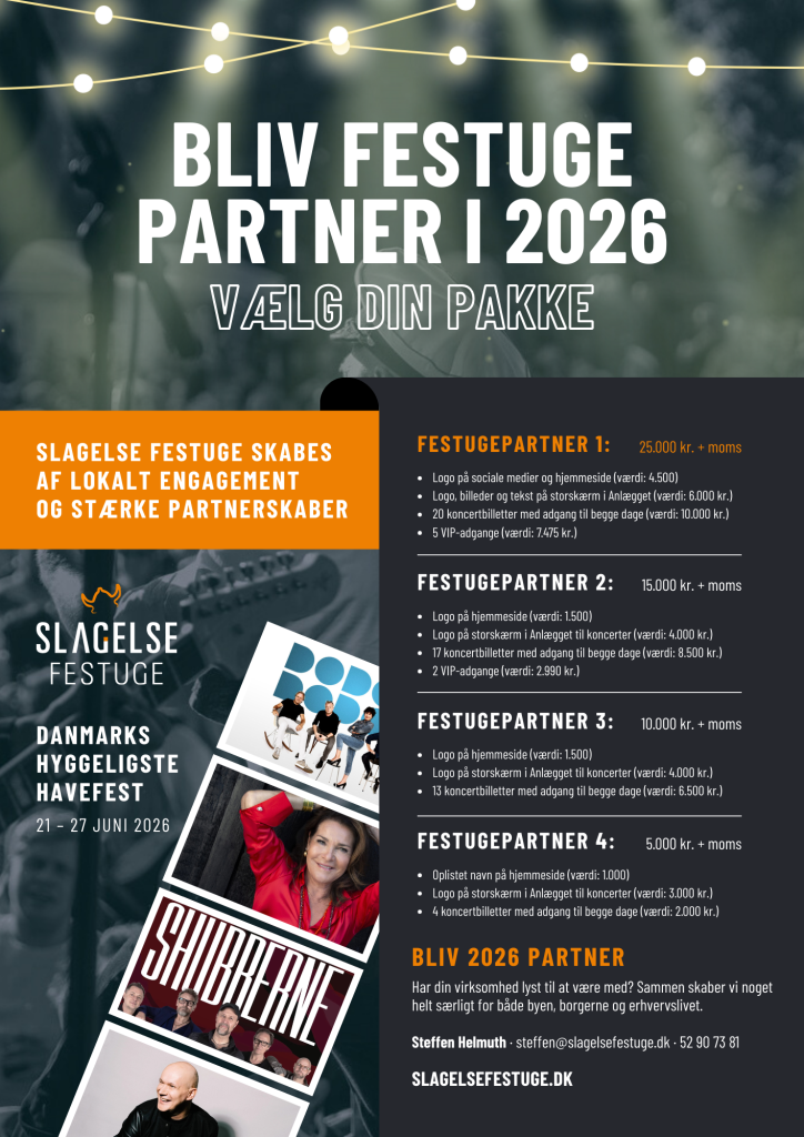 Slagelse Festuge skabes af lokalt engagement og stærke partnerskaber. Og lige nu søger vi nye samarbejdspartnere, der har lyst til at være med til at løfte festen endnu højere. Som partner får man synlighed før, under og efter festugen – og man er med til at give alle gæsterne en uge fyldt med gratis oplevelser og liv i hele byen.